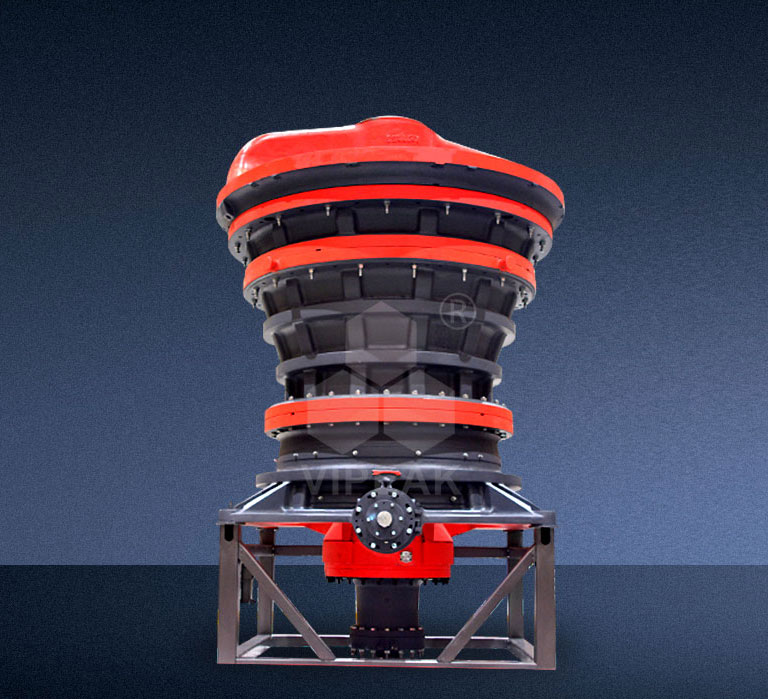 Необходимо снять поперечную балку, чтобы можно было легко заменить вкладыш и уплотнение поперечной балки, даже если приходится демонтировать поперечную балку, есть вспомогательный инструмент — гидравлический разделитель поперечных балок. Гайка для фиксации подвижного конуса с режущим кольцом упрощает демонтаж накладки подвижного конуса. Автоматическая система регулировки положения главной оси легко управляет крупностью продукции и компенсирует износ накладок.