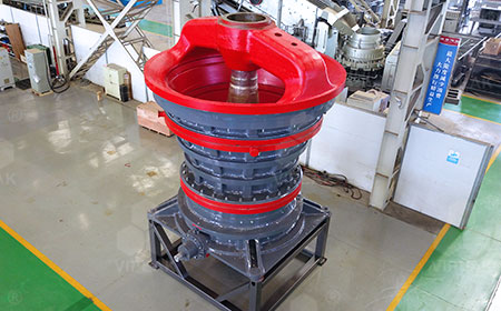 Крушитель типа HGT с вращающимся циклом в основном состоит из поперечины, верхней, средней и нижней рамы, подвижного конуса, эксцентрической втулки, привода и гидравлического цилиндра. Во время работы оборудования электродвигатель вращает горизонтальную ось, которая через шестерню вращает эксцентрическую втулку, а та, в свою очередь, заставляет подвижный конус совершать круговые качки, обеспечивая непрерывное сжатие и дробление камней. Размер выпускного отверстия можно изменить за счет регулировки гидравлического цилиндра внизу подвижного конуса, что облегчает регулировку крупности продукции; кроме того, гидравлический цилиндр обеспечивает защиту от попадания железа: при попадании неразрушаемого объекта в дробильную камеру гидравлический цилиндр автоматически опускает подвижный конус, освобождая объект и защищая крушитель.